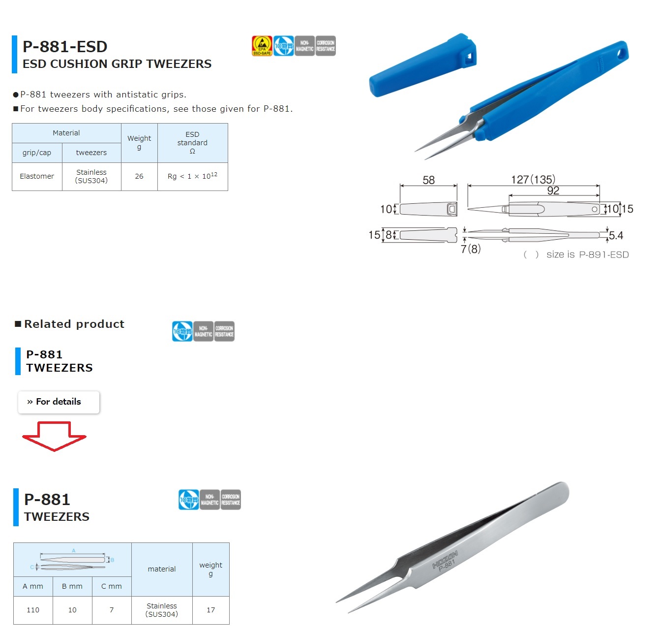 Nhíp có tay nắm chống tĩnh điện HOZAN P-881-ESD